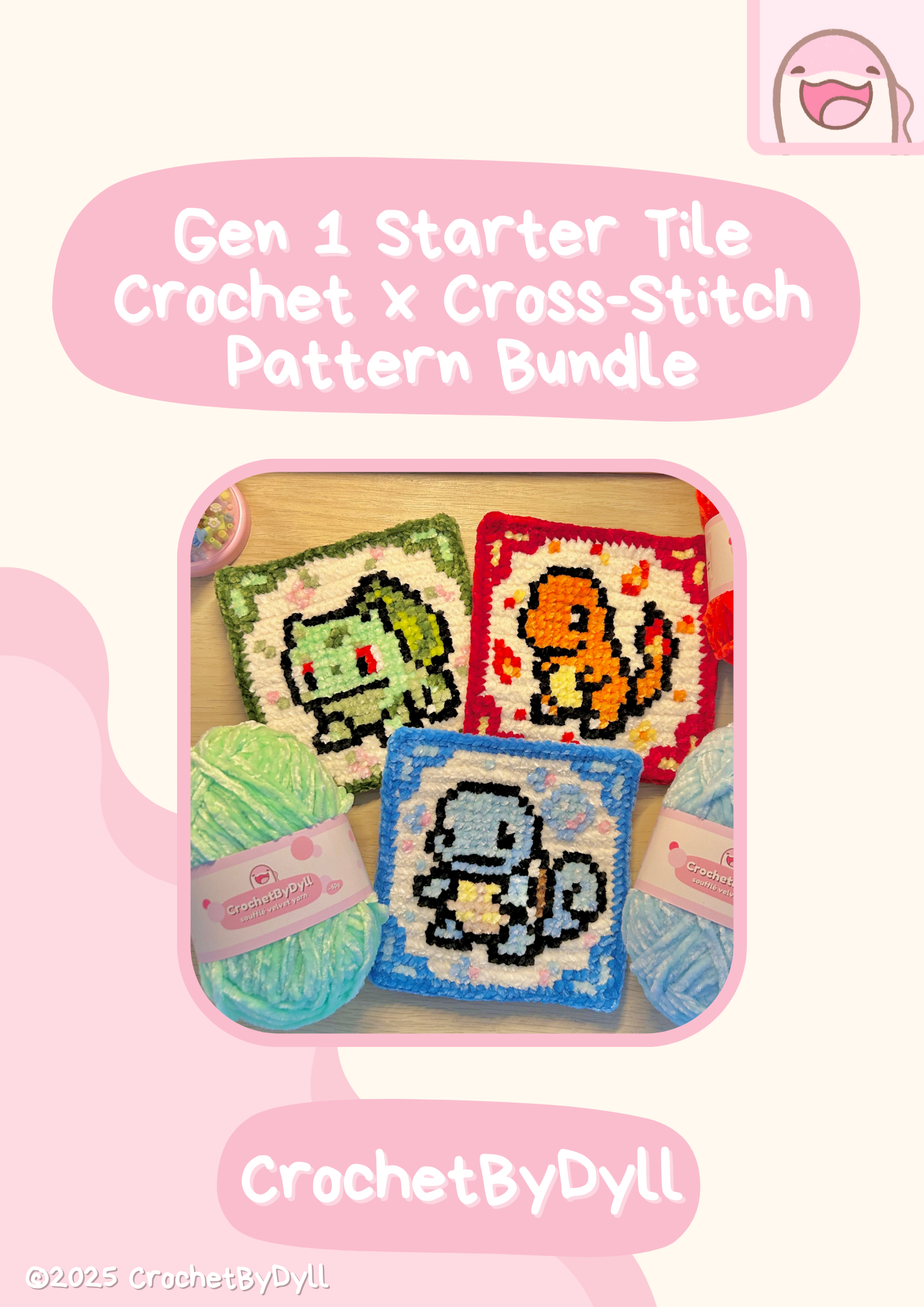 Gen 1 Starter Trio Crochet x Cross-Stitch Pattern Bundle – Bulbasaur, Charmander & Squirtle-Inspired